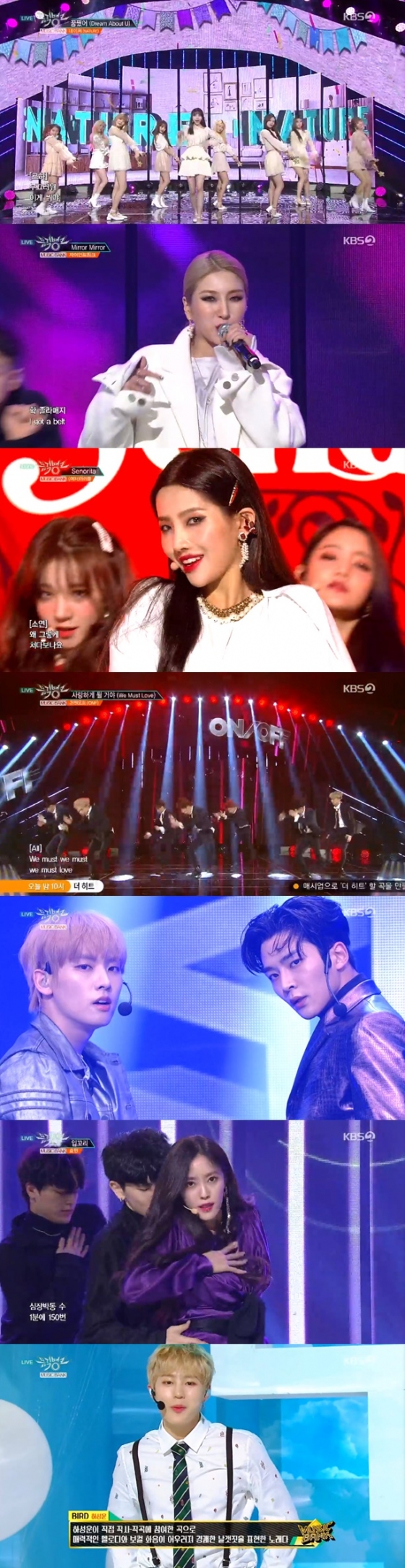 이날 방송에서는 (여자)아이들이 'Senorita'(세뇨리타)로 컴백무대를 가졌으며, 그룹 워너원으로 활동했던 하성운이 타이틀곡 'BIRD'를 갖고 솔로 데뷔 무대를 펼쳤다.