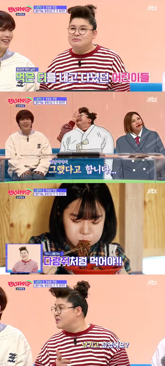그녀는 "짜장면 먹는 거를 고기 먹은 것처럼 티내려고"라면서 "동네 사람들이 속닥속닥 했다"라고 말했다. 또 김숙과 짧은 콩트를 통해 짜장면 먹은, 곱빼기 먹었다는 말에 "재벌아이가"라고 해 웃음을 자아냈다.
