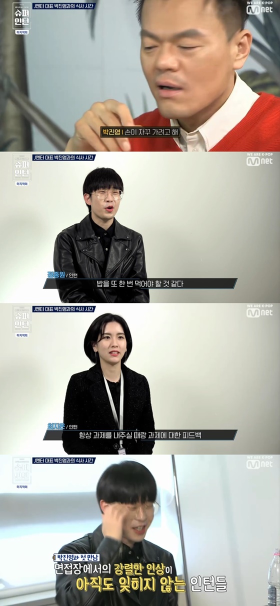 가수 박진영이 JYP 엔터테인먼트 정직원을 뽑는 '슈퍼인턴'의 인턴들과 밥 먹는 자리를 가졌다.