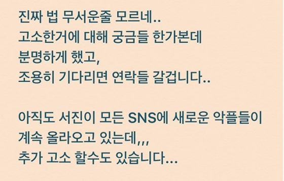 이어 "아직도 서진이 모든 SNS에 새로운 악플들이 계속 올라오고 있는데 추가 고소할 수 도 있다"고 밝혔다.