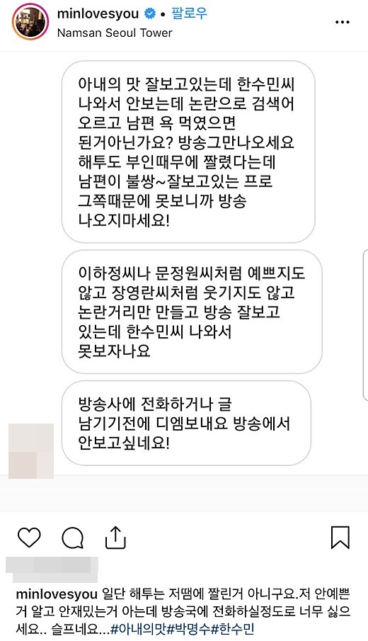 한수민은 24일 자신의 인스타그램에 악플러가 보낸 메시지를 공개했다. 해당 글을 올린 네티즌은 한수민에게 "논란으로 검색어 오르고 남편 욕 먹였으면 된 거 아닌가요? 방송 그만 나오세요. '해투'도 부인 때문에 잘렸다는데 남편이 불쌍. 잘 보고 있는데 때문에 못 보니까 방송 나오지 마세요"라고 썼다.