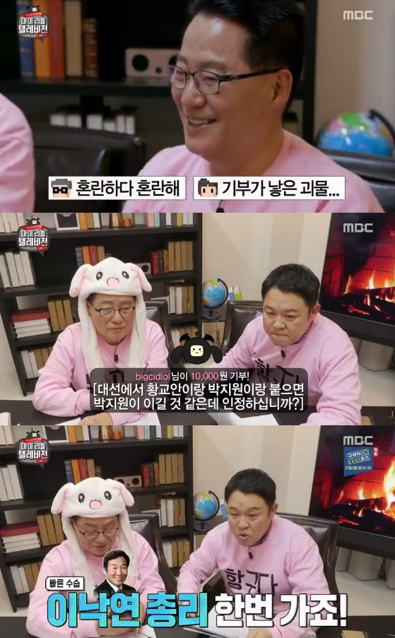 이어 김구라는 "요즘 인싸템이다"라고 토끼 모자를 꺼냈다. 박지원에게 "질문에 답하기 곤란하면 토끼 귀를 올리면 된다"라고 설명했다. 이어 채팅창에 "대선에서 황교안이랑 박지원이랑 붙으면 박지원이 붙을까요?"라는 글이 올라왔다. 박지원은 "이 질문은 기분이 굉장히 좋다. 내가 이긴다"고 답했다.