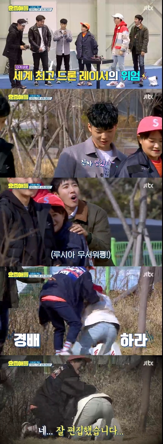 이런 유재석에게 황광희는 "연예인은 카메라를 등지면 안 된다고 해놓고 도망갔다"며 핀잔을 주어 웃음을 선사했다. 이날 유재석은 드론이 빨라질 때마다 호들갑을 떨었다.