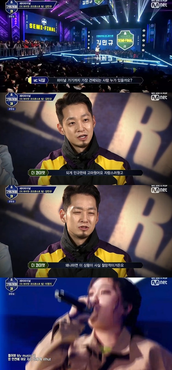 '고등래퍼 3'의 김민규가 심각한 몸 상태에도 열정을 다하는 모습을 보였다. 그러나 파이널 무대에 진출하지 못했다.