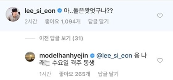 이를 본 배우 이시언은 "아 둘은 봤구나?"라는 댓글을 적었다. 마치 자신을 빼놓고 만나 서운하다는 듯한 감정을 표현한 것. 이에 한혜진은 "응 나래는 수요일 격주 동생"이라고 답글을 남겼다.