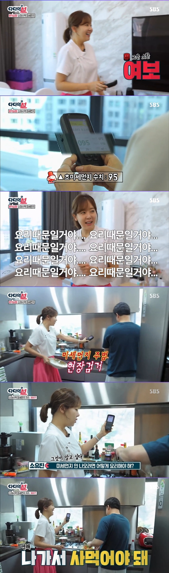 백종원이 요리를 시작하자 금세 연기로 가득 차더니 미세먼지 수치가 999까지 치솟았다. 경악한 소유진은 "미세먼지 없이 요리를 하려면 어떻게 해야 하냐"고 물었다. 이에 백종원은 "밖에 나가서 사먹어야 한다"고 말해 웃음을 자아냈다.