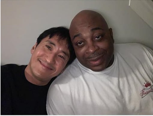 공개된 사진 속 신현준은 조니 맥도웰과 얼굴을 맞대고 행복한 미소를 짓고 있다.