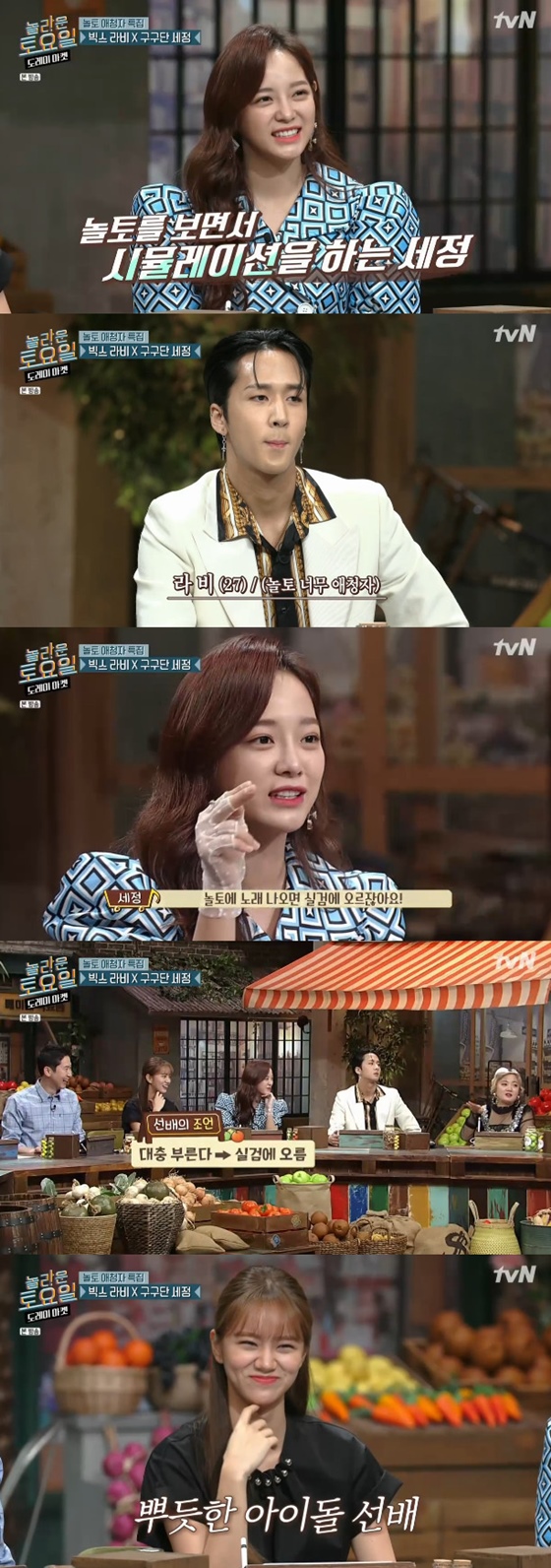 20일 오후 방송된 tvN 예능프로그램 '놀라운 토요일-도레미 마켓'(이하 '놀토')에서는 그룹 빅스 멤버 라비와 구구단 멤버 세정이 게스트로 출연했다.