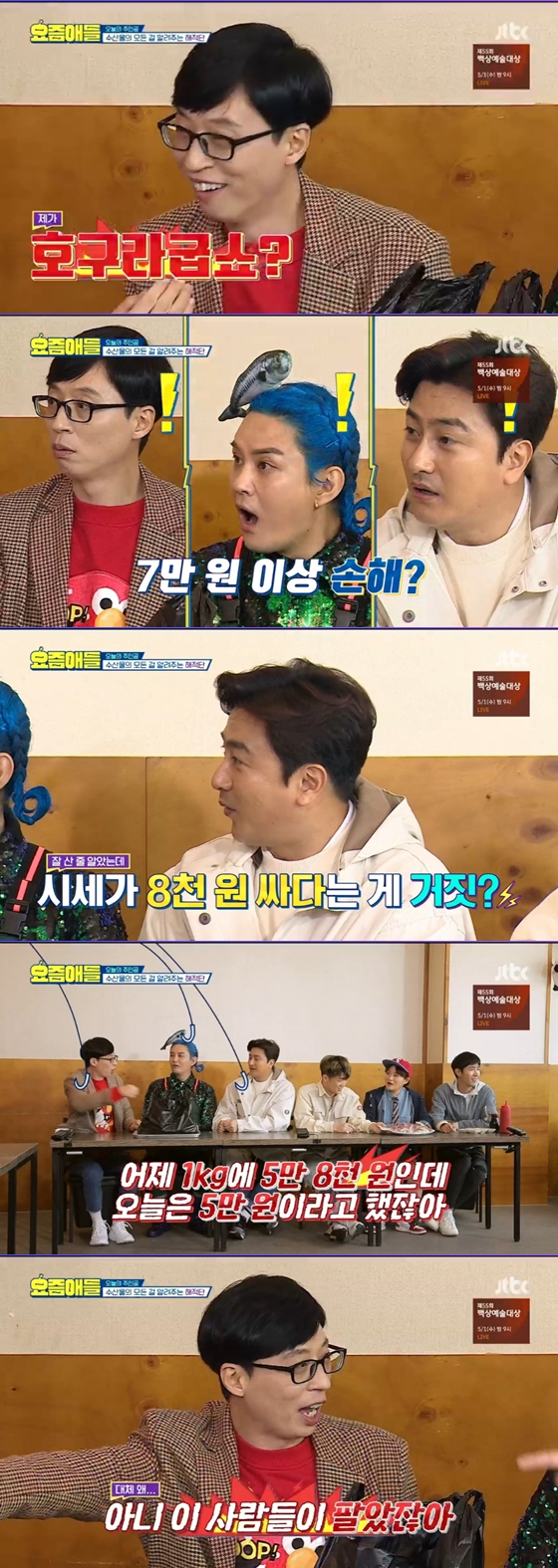 '요즘애들'에서 유재석이 수산물 시장에서 덤터기를 쓴 자신의 모습에 놀랐다.