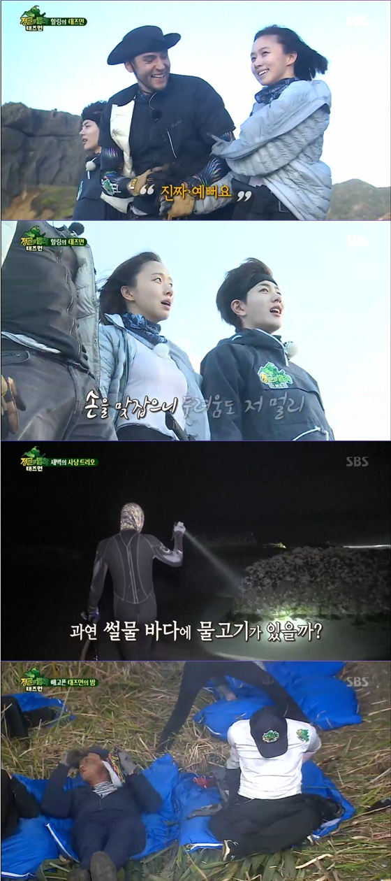 한편, 태즈먼섬에 도착한 첫 날에 적응하느라 힘들었던 멤버들은 하루 일과를 마치고 잠자리에 들었다. 모두가 자고 있는 야심한 밤에 강경준이 갑자기 일어나 김승수와 김병만을 깨웠다. 이들은 낚시 도구를 챙겨 바다로 향했다.
