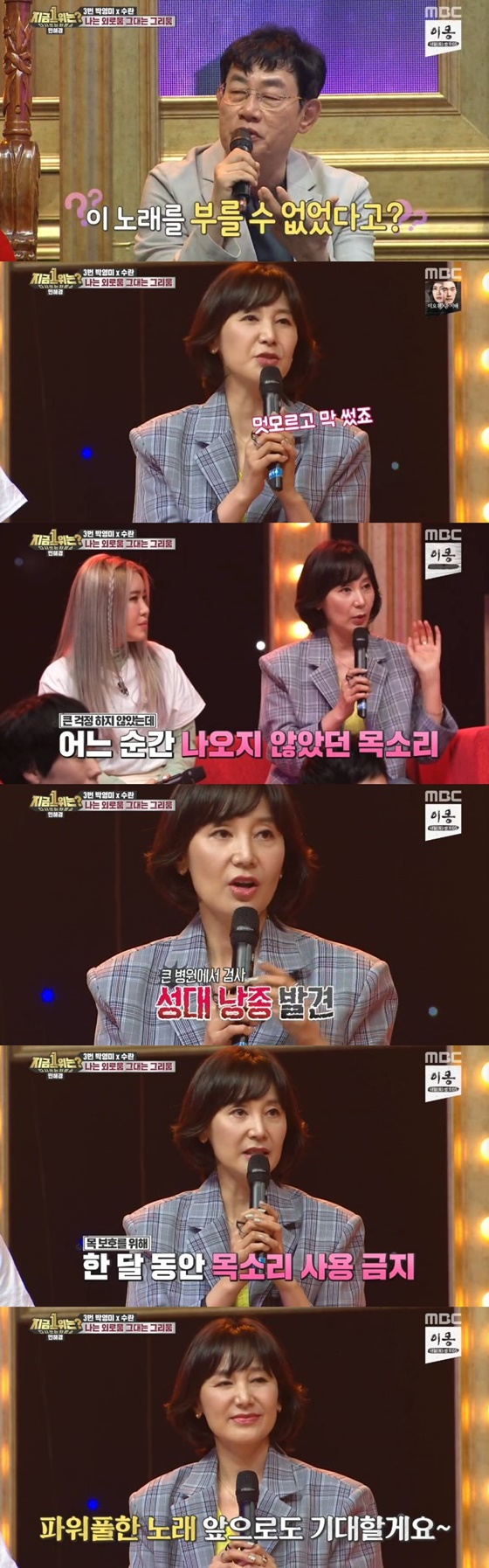 박영미는 "제가 성대수술을 한 적이 있다. 어렸을 때 목을 너무 막 썼다. 큰 병원에서 검사했더니 성대낭종이 발견됐다"고 답했다.