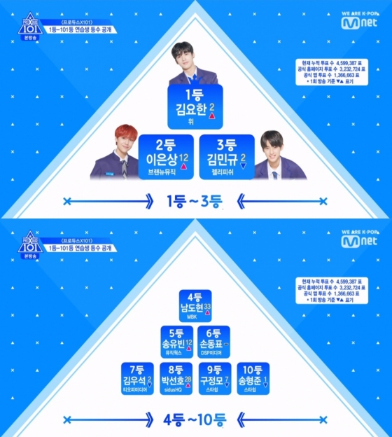 싸이더스HQ 박선호는 36등에서 8등으로 올랐지만 스타쉽 구정모는 2등에서 9등으로, 스타쉽 송형준은 9등에서 10등으로 순위가 낮아졌다.