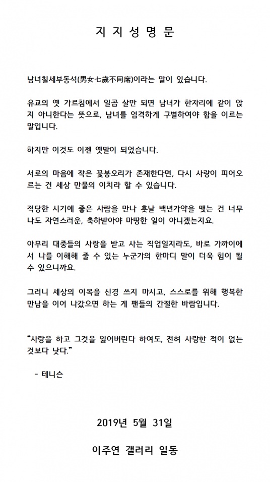 팬들은 이 글을 통해 "적당한 시기에 좋은 사람을 만나 훗날 백년가약을 맺는 건 너무나도 자연스러운, 축하받아야 마땅한 일이 아니겠는지요"라며 "세상의 이목을 신경쓰지 마시고, 스스로를 위해 행복한 만남을 이어 나갔으면 하는게 팬들의 간절한 바람입니다"라고 지지글을 전했다. 무엇보다 이 글에는 '백년가약'이라는 단어까지 등장하며, 무리하게 앞선 추측까지 담겨 있다.