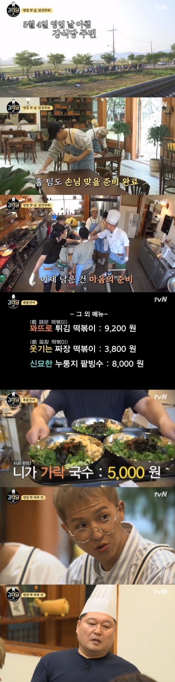 강호동은 직접 반죽하고 뽑은 면발로 가락국수를 만들었고, 짜장 떡볶이와 빙수 등의 메뉴가 추가 됐다.
