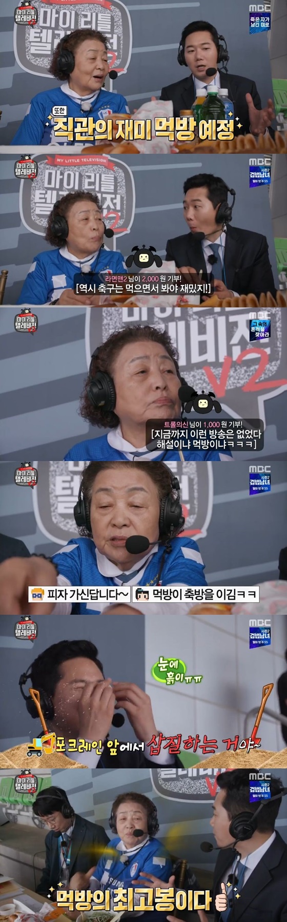 7일 오후 방송된 MBC 예능 프로그램 '마이 리틀 텔레비전 V2'에서는 '먹방'을 하면서 축구 응원 겸 해설에 나선 강부자의 모습이 담겼다.
