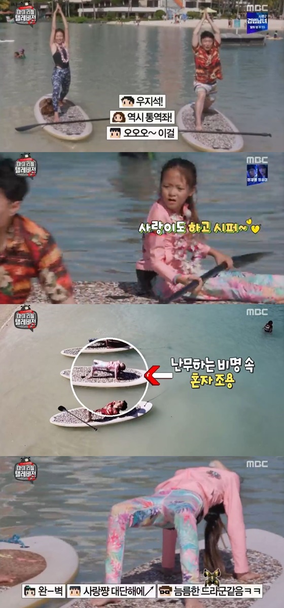 한편 야노시호는 딸 추사랑 양, 통역사 우지석과 함께 서프요가에 나섰다. 야노시호는 서핑 보트 한가운데 자리 잡고 자세를 취하도록 했다. 야노시호는 자신이 가르치면서도 "무서워"라면서 비명을 내질렀다. 반면 추사랑 양은 완벽하게 자세를 해내 감탄을 자아냈다.