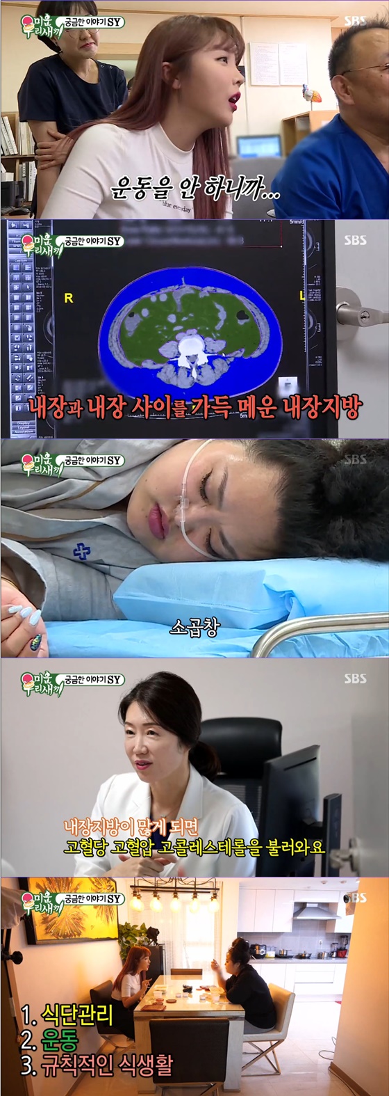 또한 의사는 "간 초음파 사진을 봤더니 지방간이 너무 많아서 간이 하얗다. 중등도 지방간이라고 간에 지방이 많이 낀 상태다"라고 했다.