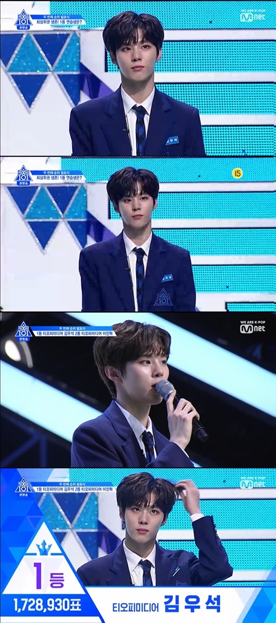 '프로듀스X101' 김우석 연습생이 2차 순위 발표식에서 압도적인 득표로 1위에 올랐다.