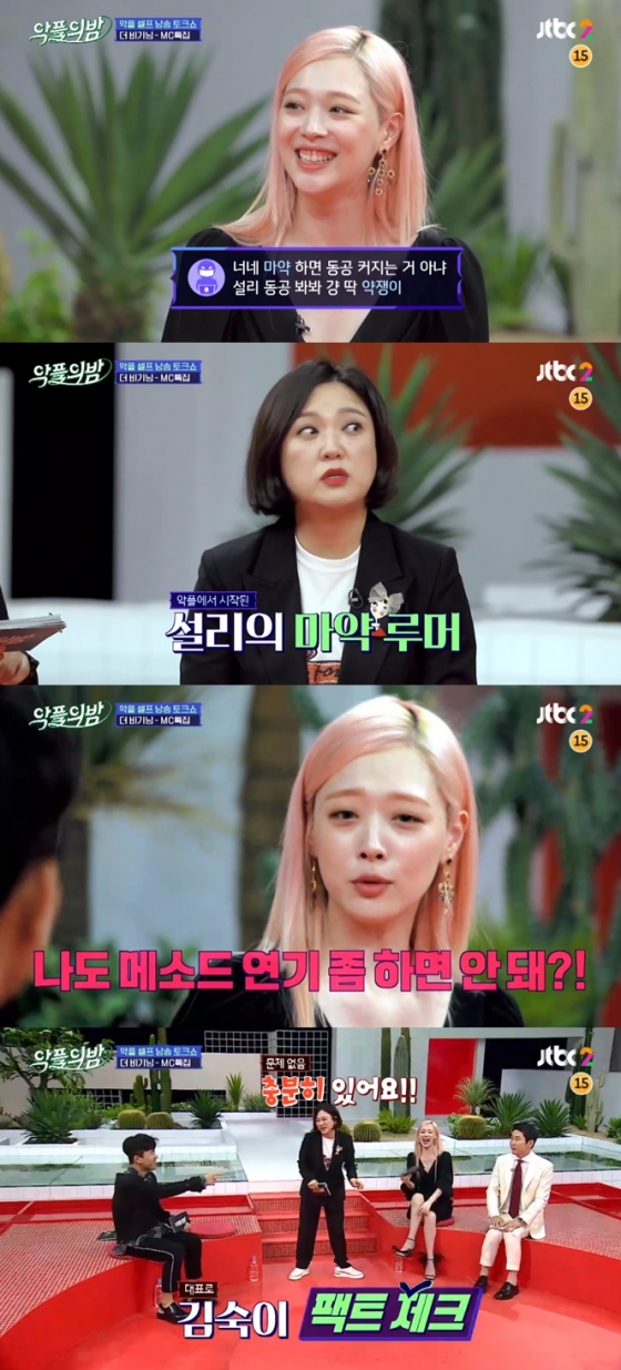 설리는 자신의 마약 루머에 "내가 영화 '리얼'을 찍었다. 마약을 한 인물을 연기하느라 마약 영화를 하루에 다섯 번씩 보면서 공부하니까 주변 친구들이 '네가 히스레저냐'고 하더라. 나도 메소드연기 해보면 안 되나 싶었다"며 "여기서 머리카락 뽑을 수 있다"고 억울해했다.