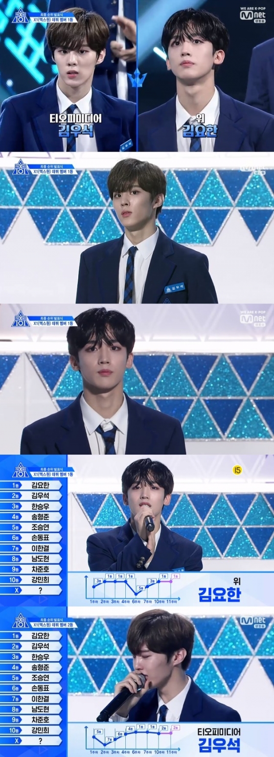 이후 엑스원의 센터이자 1위 후보 두 명으로 김요한과 김우석이 공개됐다. 두 사람은 이전 회차들에서도 1위 쟁탈전을 벌여왔다. 이 가운데 1위로는 김요한의 이름이 불렸다. 득표수 총 133만 4011표를 받았다. 이에 따라 김우석이 2위로 데뷔하게 됐다.