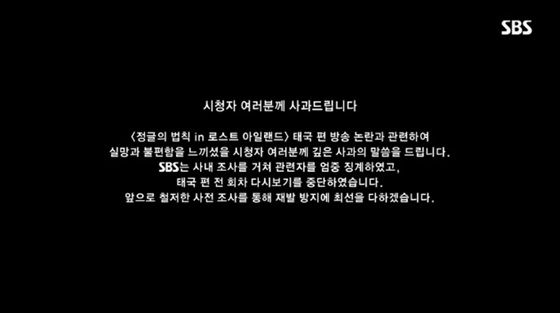 SBS는 "'정글의 법칙 in 로스트 아일랜드' 태국 편 방송 논란과 관련하여 실망과 불편함을 느끼셨을 시청자 여러분께 깊은 사과의 말씀을 드립니다"고 했다.