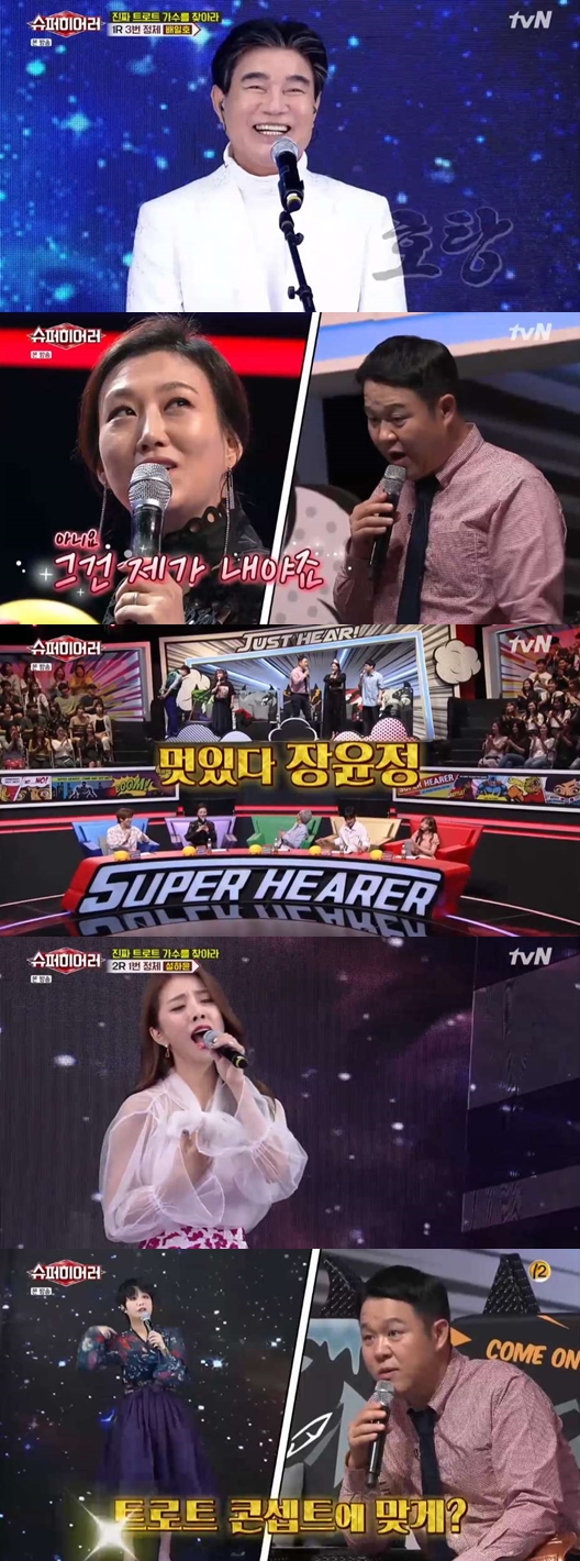 21일 오후 방송된 tvN 예능프로그램 '슈퍼히어러'에서 '진짜 트로트 가수를 찾아라' 코너가 진행됐다. '슈퍼히어러' 팀에는 장윤정을 필두로 강타, 최유정, 김종진, 케이윌 등이 배정됐고, '빌런' 팀에는 김구라를 필두로 엄현경, 황제성 등이 배정됐다.