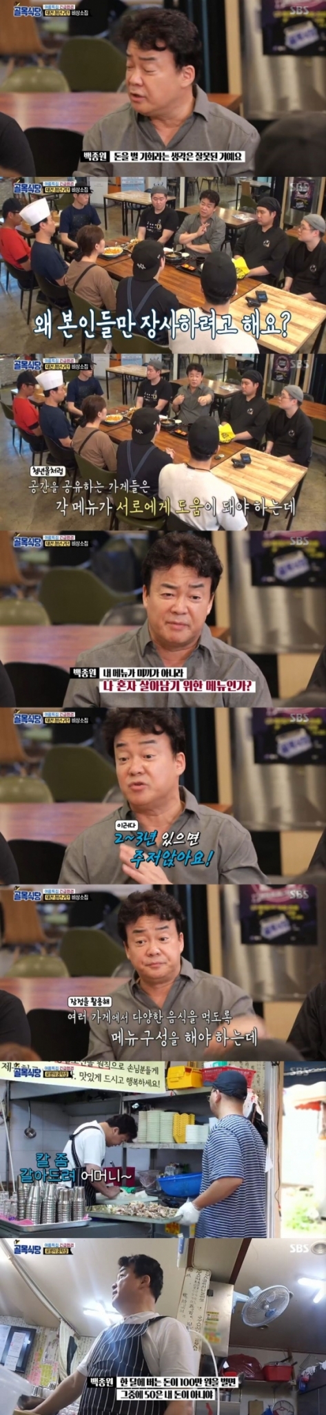백종원은 "한 달에 버는 돈이 100만원을 벌면 그 중에 50만원은 내 돈이 아니야, 주방에 써야 해. 명심해요. 그거 다 내 돈이라고 생각하면 7~8년 안에 절단나요. 내가 수십명을 봤어"라며 경험에서 우러나온 말을 건넸다.