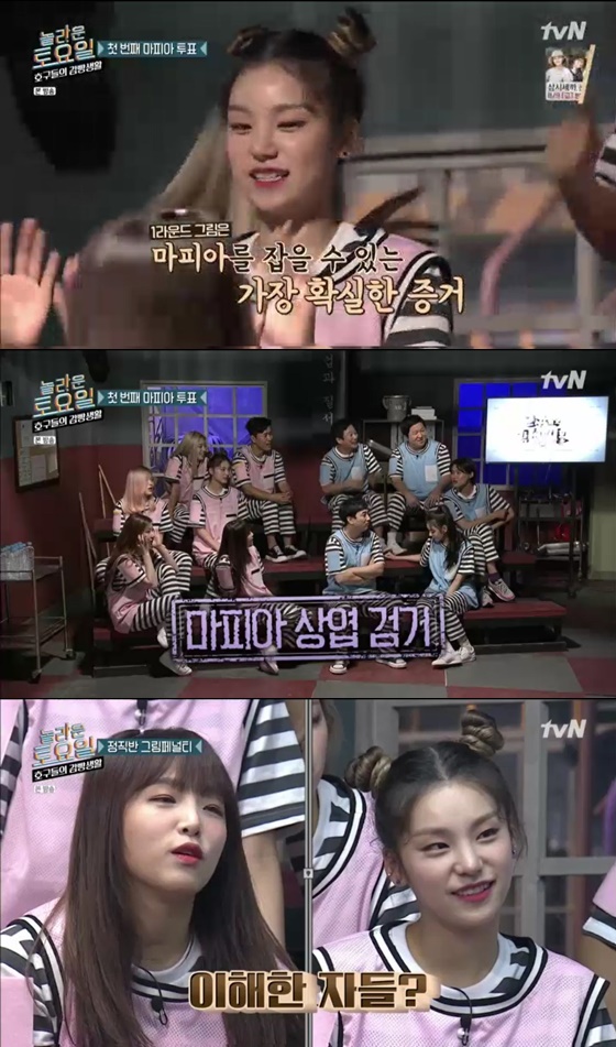 3일 오후 방송된 tvN 주말 예능프로그램 '놀라운 토요일, 호구들의 감빵생활'에서 예능 초보 걸그룹 ITZY 멤버들의 예능 생활 적응기가 그려졌다. 먼저 멤버들은 '마피아'를 정하고 팀을 나눠 게임에 돌입했다.