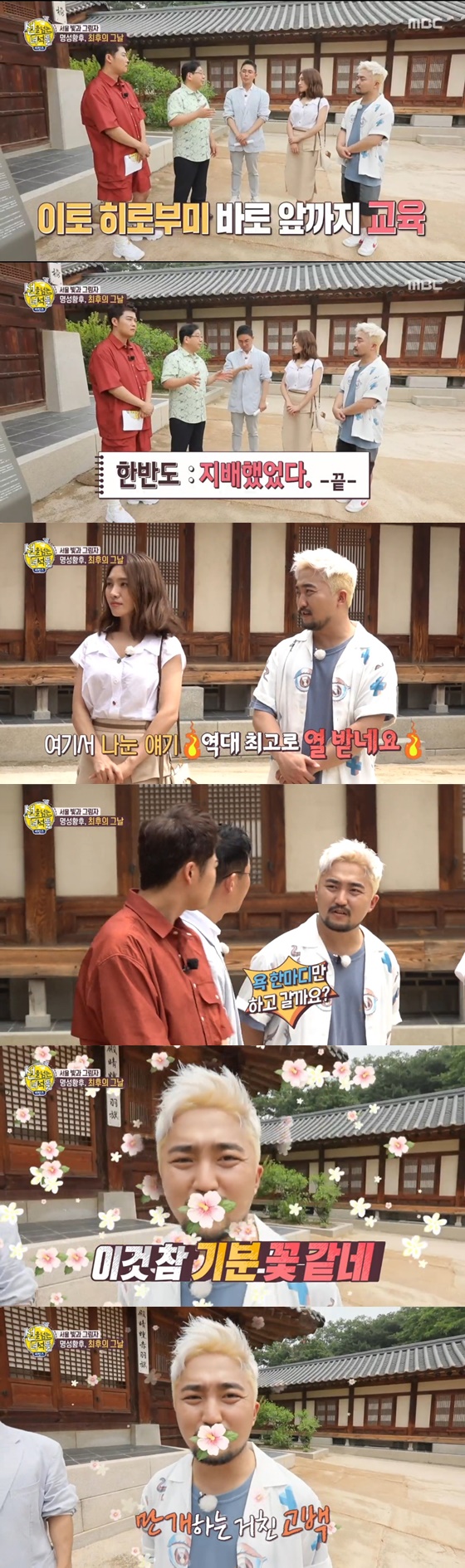 오늘 방송에서 광화문 앞에서 모인 멤버들은 '우리나라가 망한 시간'을 좇아갔다. 광화문을 지나 경복궁 속 명성황후가 시해된 명성황후의 침전 '건청궁 곤녕합' 앞에서 역사 강사 설민석이 을미사변에 대해 설명했다.