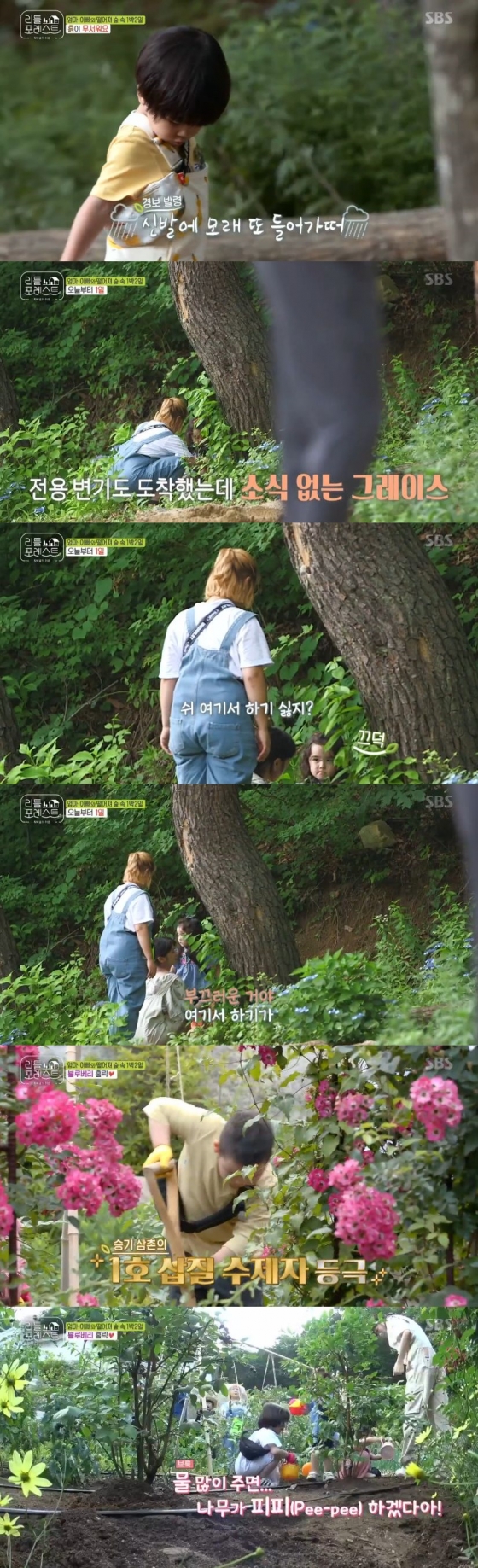 그레이스는 화장실이 가고 싶은 것을 드러내 박나래는 그레이스의 전용 변기를 밝으로 가지고 나왔다. 아이들과 조금 떨어진 수풀에 변기를 놓고 그레이스가 소변을 누기 기다리던 박나래는 그레이스가 계속해서 앉아만 있자 정소민에게 도움을 요청했다.