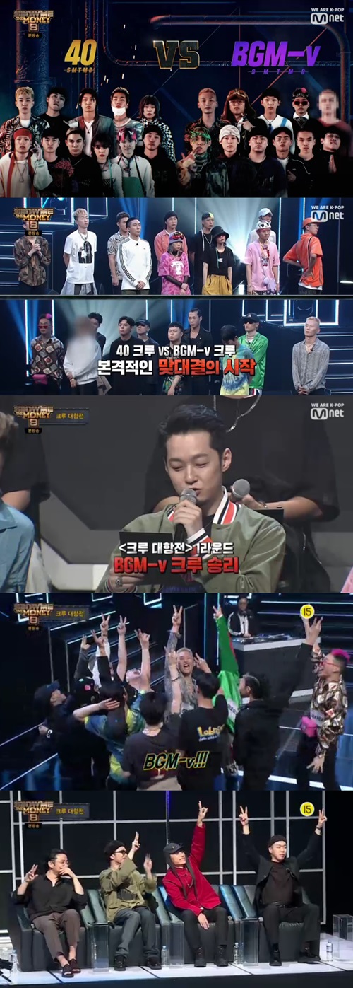 '쇼미더머니8' BGM-v 크루가 크루 대항전에서 승리하며 신곡 배틀에서의 패배를 만회했다.