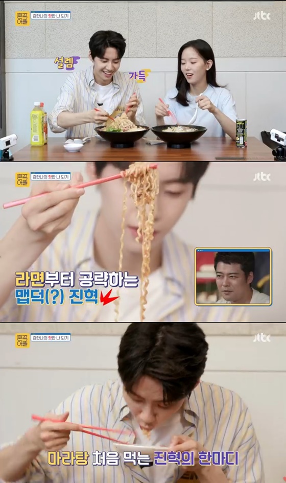 24일 오후 방송된 JTBC 주말 예능프로그램 '혼족어플'에서는 강한나가 특별게스트 이진혁과 함께 '맵덕'을 위해 마라탕 먹기에 도전하는 장면이 그려졌다.