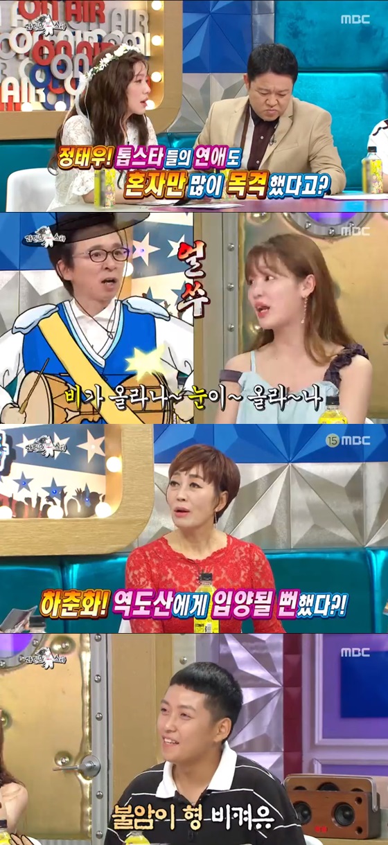 28일 오후 방송된 MBC 예능프로그램 '라디오스타'에서는 가수 하춘화, 배우 정태우, 걸그룹 오마이걸 승희, 소년 농부 한태웅이 게스트로 등장했다.