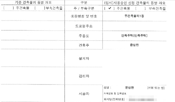 다음으로 오해가 있어 바로 잡습니다. A사는 시공자가 아닙니다. 건축주 직영공사이기 때문에 시공자는 '윤상현' 그 자신입니다. 아래는 건축허가서인데 시공자가 윤상현이라 분명히 기재되어 있습니다. 지금까지 윤상현이 A사를 시공자라고 표현해 온 것은 A사에게 하자책임을 뒤집어 씌우기 위한 고안된 고도의 전략적인 '네이밍'이나 '장치'가 아닌가 하는 의심마저 듭니다.