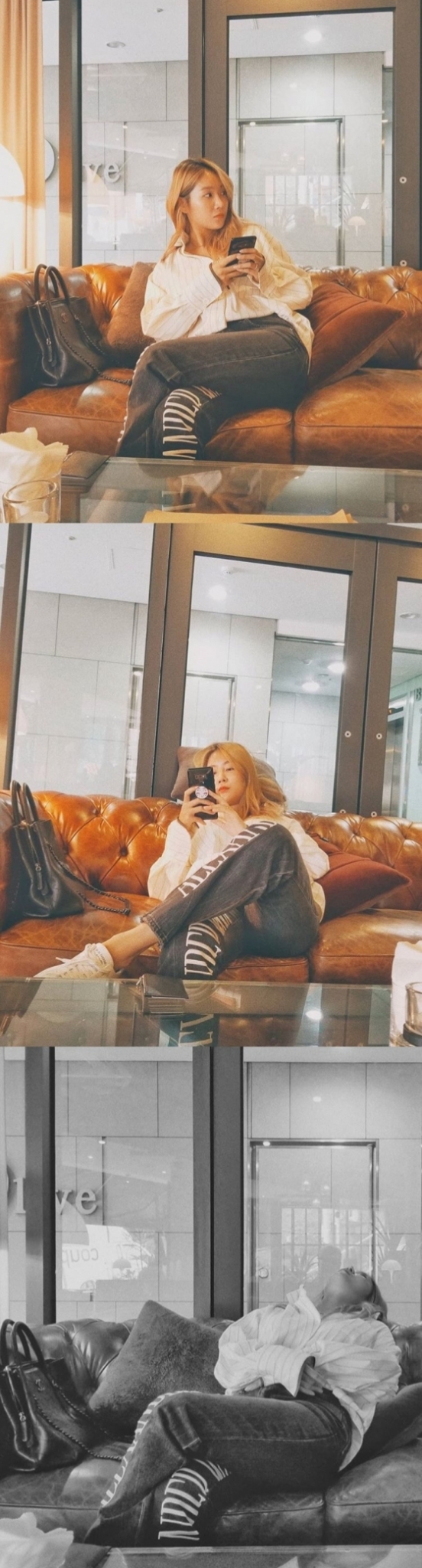 공개된 사진 속 소유는 소파에 몸을 기댄 채 휴대폰을 보거나 아예 몸을 뒤로 눕혀 배부른 듯 배를 어루만지고 있다.
