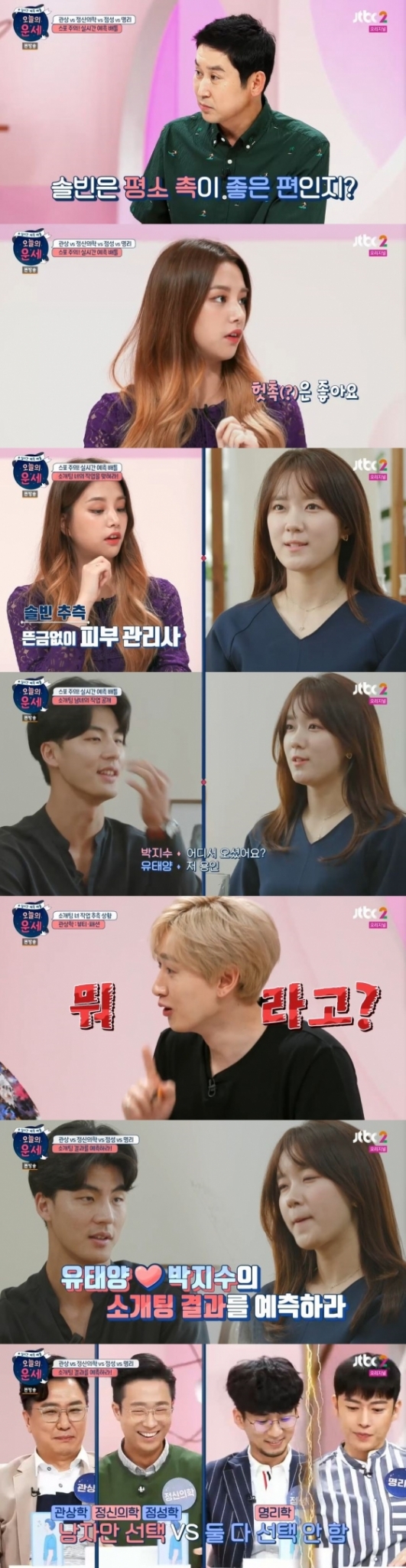 18일 오후 방송된 JTBC2 예능 프로그램 '오늘의 운세'에서는 게스트로 솔빈이 출연해 소개팅 상황을 지켜보는 모습이 담겼다.