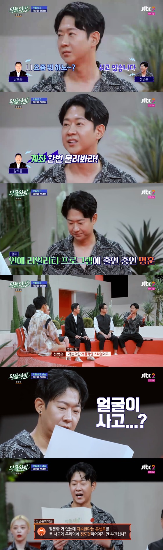 20일 오후 방송된 JTBC2 예능프로그램 '악플의 밤'에서는 천명훈이 게스트로 출연해 실제 연애스타일, '노훈수' 활동, '연애의 맛2' 출연 등에 대한 솔직한 이야기를 전했다.