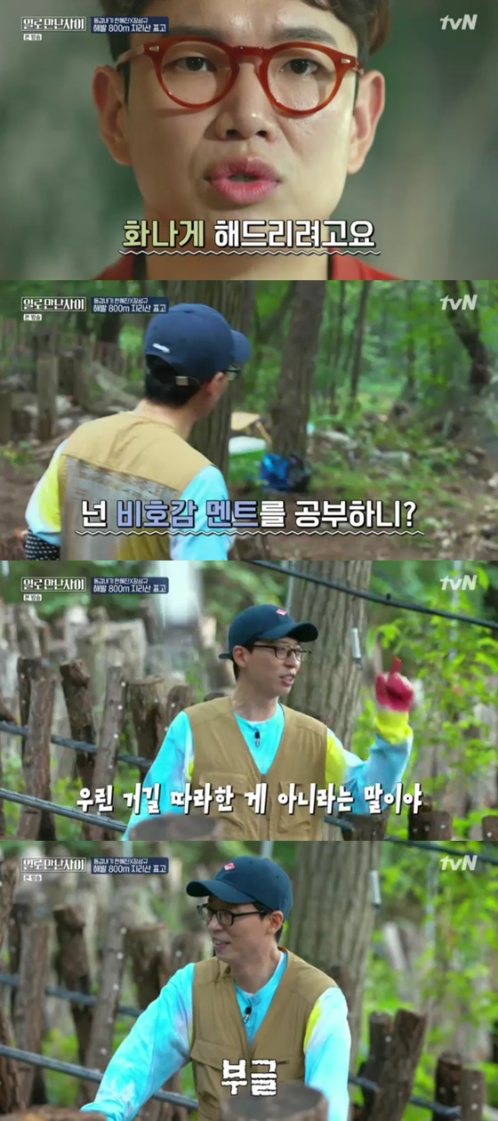 오전 일을 끝낸 세 사람은 사장님이 준비해 준 '표고버섯밥'을 먹으며 이야기를 나눴다. 장성규는 유재석에게 "정상에 있는 느낌이 어떠냐, 산소가 충분하냐"며 깐족됐다. 이때도 유재석은 "입 닥치라"며 응수했다.