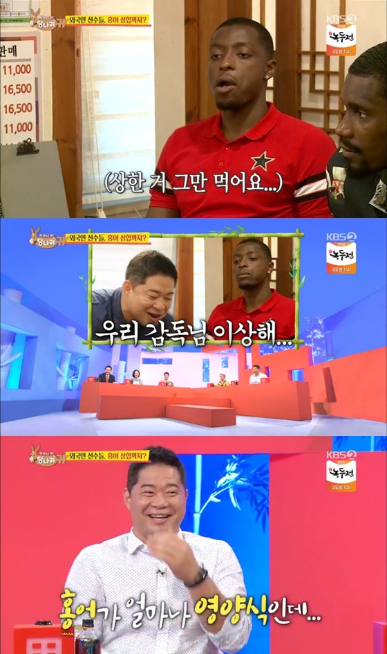 29일 오후 방송된 KBS 2TV 주말 예능프로그램 '사장님 귀는 당나귀 귀'에서 LG세이커스에 새로온 외국인 선수 캐디라렌 선수와 버논 맥클린 선수가 한국 음식에 적응하는 시간을 가졌다.