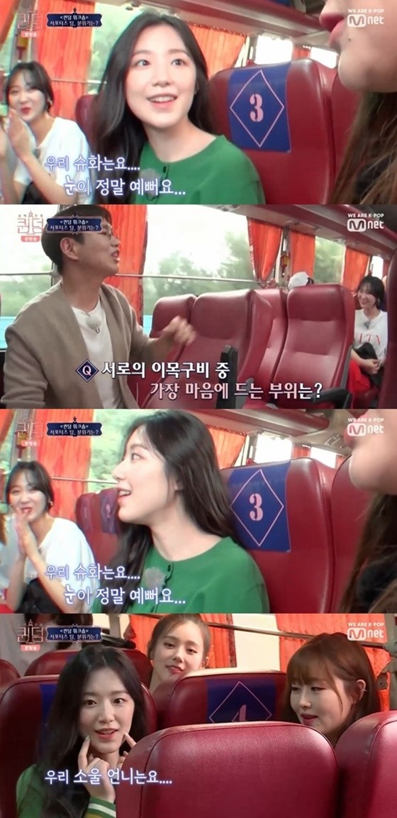 서포터즈 팀은 서로의 이목구비중 마음에 드는 픽을 말하기 게임을 했다. 러블리즈의 베이비소울은 "슈화의 눈이 가장 예쁘다"고 말했고, 아이들 슈화는 "소울언니는 보조개가 예쁘다고 했다"