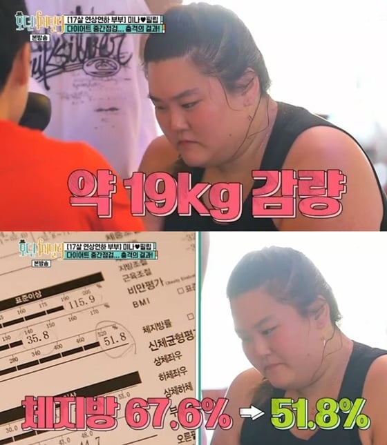 박수지는 류필립, 미나 부부가 보는 앞에서 다이어트 중간 점검이 이뤄졌다. 박수지는 기존 134kg에서 115.9kg로 감량했고, 골격근도 37%에서 35.8%, 체지방은 67.6%에서 51.8%로 감소해 한층 건강해진 모습을 보였다.