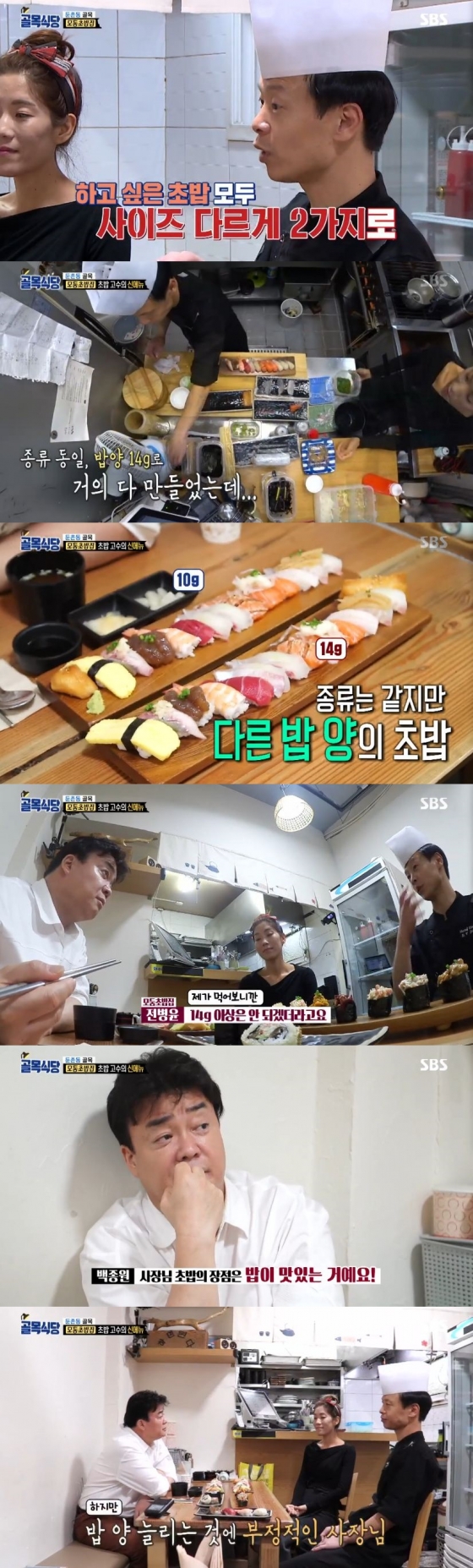 이날 백종원은 제일 먼저 모둠 초밥집을 찾았다. 모둠 초밥집 사장님은 지난주 백종원의 조언대로 밥 양을 두 가지로 준비했다. 10g과 14g으로 밥의 양에 차이를 뒀다.