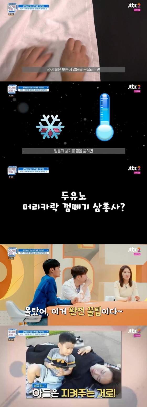 식용유, 마요네즈, 린스가 바로 그 주인공. 이것 중 하나를 머리에 바르고 빗어 주면 껌이 쉽게 떼어진다고 한다. 이를 들은 장성규는 "이거 완전 꿀팁이다. 아들한테 한 번 실험해 봐야겠다"고 말해 폭소를 자아냈다.
