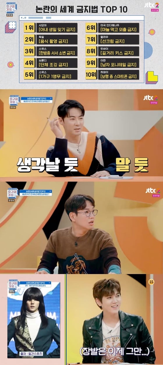21일 오후 방송된 JTBC 예능프로그램 '호구의 차트'에서는 '논란의 세계 금지법 TOP 10'을 주제로 방송됐다.