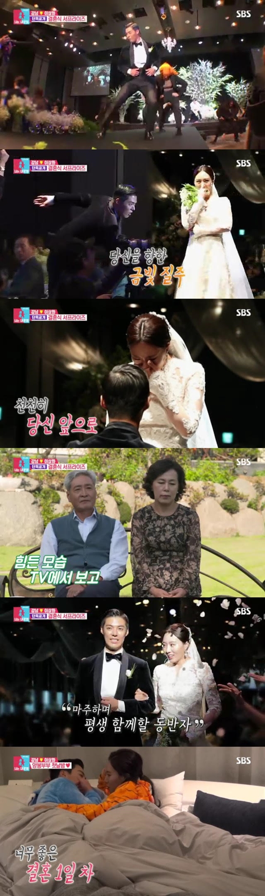 이날 방송에는 지난주에 이어 강남과 이상화의 결혼식 풀스토리가 공개됐다. 강남은 이상화를 위해 서프라이즈 이벤트를 준비, 스피드스케이팅 선수 고다이라 나오를 비롯한 이상화 절친들의 영상 편지를 준비해 큰 화제를 모았다. 그러던 중 갑작스럽게 영상이 꺼져 이상화는 물론 하객들 모두 당황한 모습을 보였다. 그러나 알고 보니 이 역시 강남이 준비한 이벤트였다.