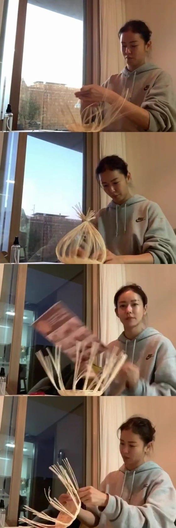 공개된 사진과 영상 속 경수진은 민낯에 '똥머리' 헤어스타일을 한 채 집중해서 나무를 얽으며 사과 바구니를 만들고 있다.