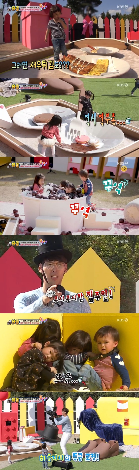 10일 오후 방송된 KBS 2TV 주말 예능프로그램 '슈퍼맨이 돌아왔다'에서 '슈돌' 출연 어린이들 윌벤저스와 라원이, 잼잼이가 거인나라에 도착해 노는 장면이 그려졌다.