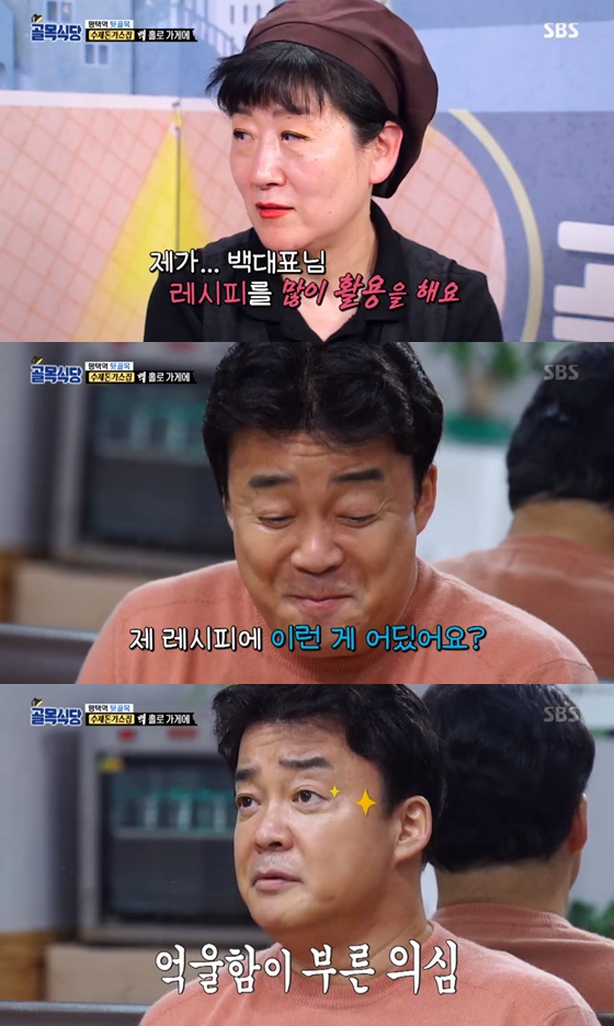 백 대표의 지적에 사장님은 "김치볶음밥 만드는 법 대표님 영상보고 배운 것"이라며 "평소 백 대표님의 레시피를 많이 활용한다"고 주장했다. 이에 백 대표는 "제 레시피에 이런 게 어딨냐. 전 김치볶음밥 이렇게 안 한다"고 반박하며 억울한 표정을 지었다.