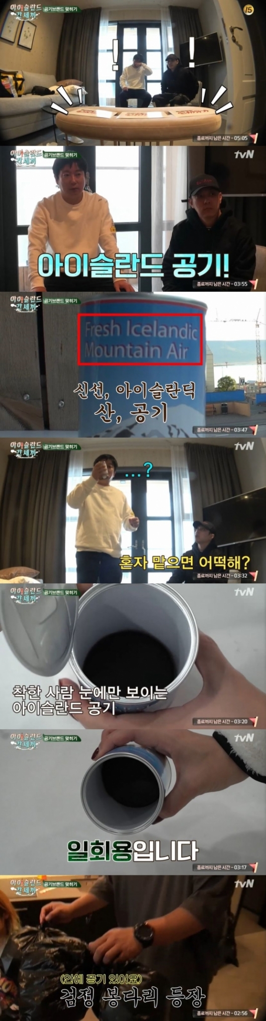 제작진은 "아이슬란드에서 관광객들이 제일 많이 사가는 게 공기"라며 실제로 캔으로 밀봉되어 파는 공기를 건넸다. 이수근은 해당 캔을 따서 공기 냄새 맡기에 나섰고, 은지원은 "혼자 맡으면 어떡하냐"면서 짜증을 냈다.