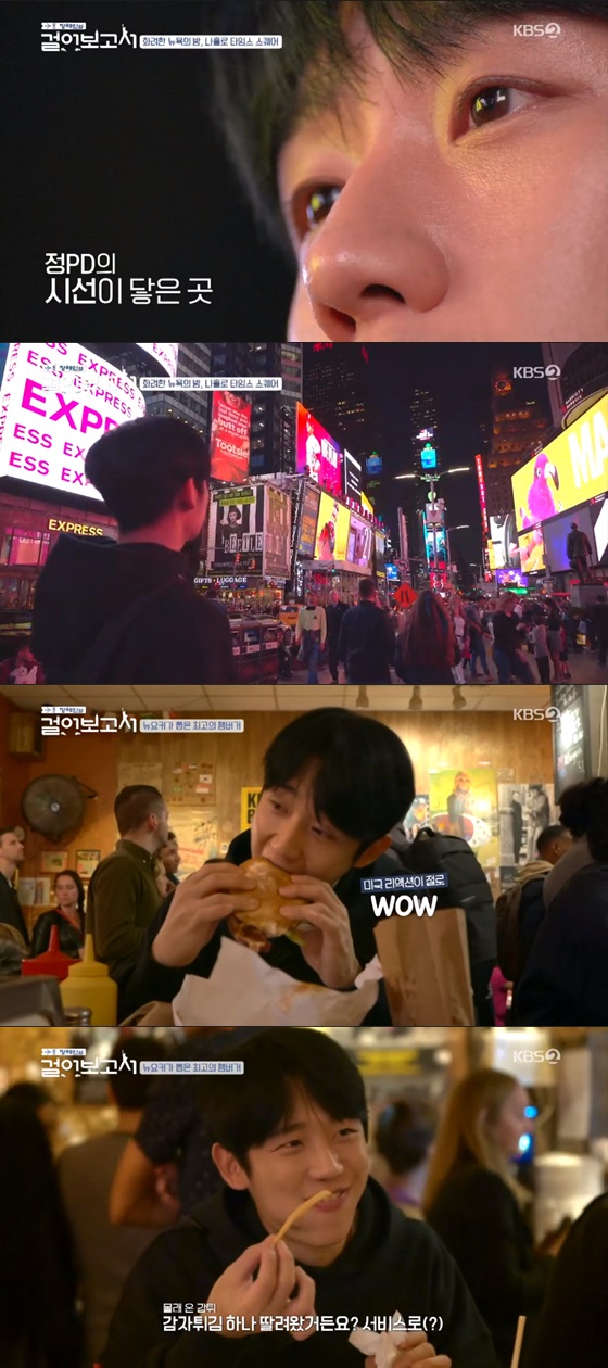26일 첫 방송된 KBS 2TV 예능프로그램 '정해인의 걸어보고서'에서는 버킷리스트였던 미국 뉴욕에 도착해 자유로움을 만끽하는 정해인의 여행기가 그려졌다. 이날 방송에서 정해인은 처음 가보는 뉴욕에서 서툴지만 귀여운 실수들로 시청자들을 미소짓게 했다.